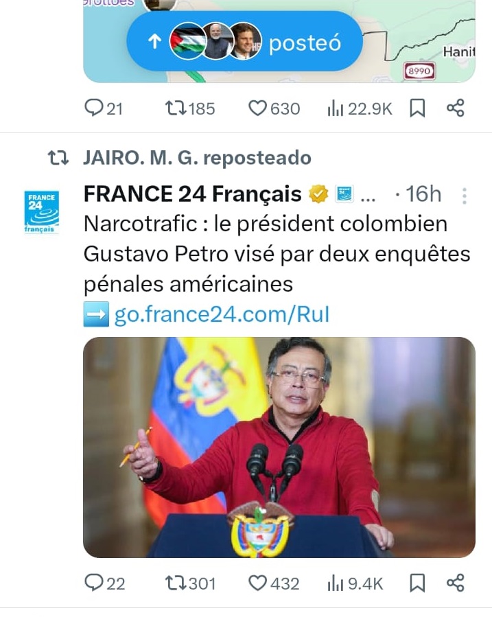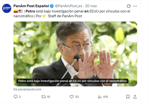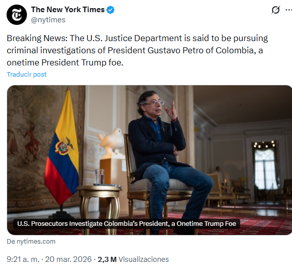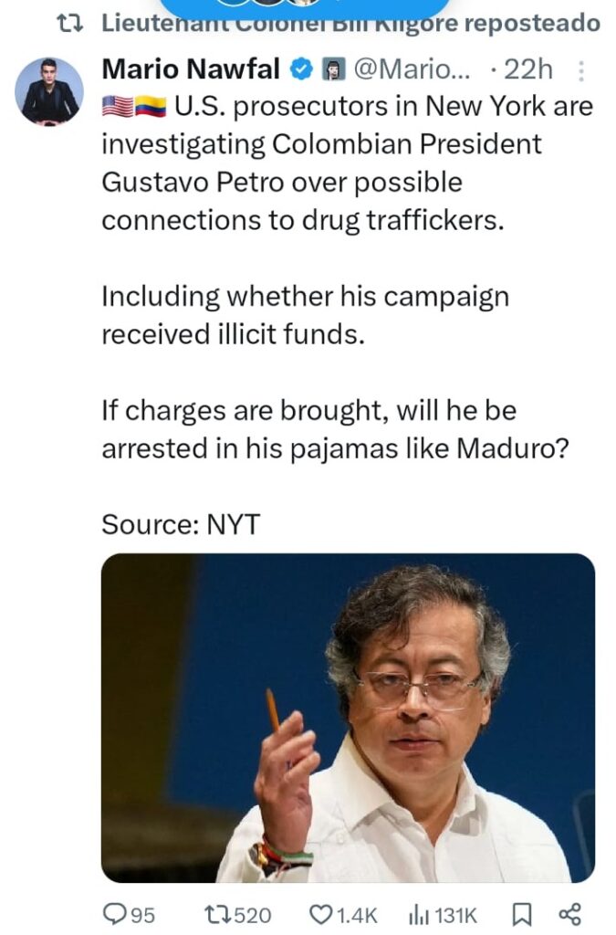 Según el New York Times, el medio que presentó la denuncia en exclusiva, fiscales de Brooklyn y Manhattan, acompañados de agentes de la DEA (Drugs Enforcement Agency) y del HSI (Servicio de Seguridad de Estados Unidos) manejan dos investigaciones contra Gustavo Petro, tanto de carácter personal como una por la presunta financiación de narcotraficantes de la campaña presidencial en 2022. Ese «trino» ya ha sido visto 2.300.000 (Dos millones trescientas mil veces) en el mundo: