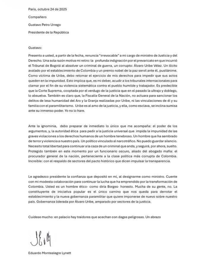 En medio de esa tensión por su enfrentamiento con el Procurador, se habría pedido por Gustavo Petro que Eduardo Montealegre presentara su carta de renuncia, ante lo cual el saliente ministro expidió una carta pública donde señala que se va porque “…Una sola razón motiva mi retiro: la profunda indignación por el prevaricato en que incurrió el Tribunal de Bogotá al absolver un criminal de guerra, un corrupto: Álvaro Uribe Vélez. Un ilícito avalado por el establecimiento de Colombia y un premio nobel de la paz servil ante él, pusilánime”, señala en su carta.