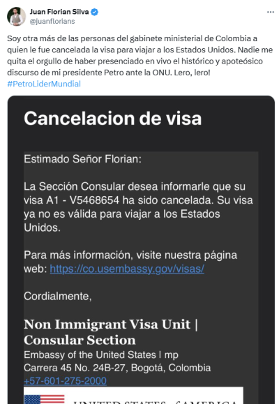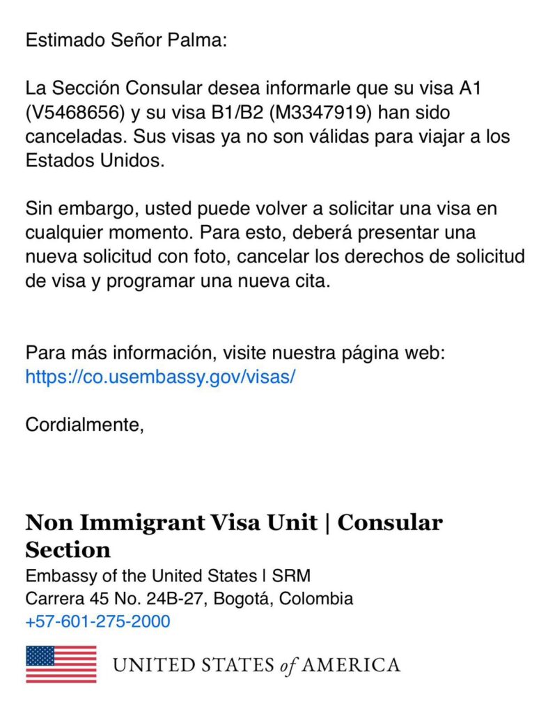 “La sección consular desea informarle que su visa A1(V5468656) y su visa B1/B2 (M3347919) han sido canceladas. Sus visas ya no son válidas para viajar a los Estados Unidos”, dicen los mensajes recibidos por los funcionarios de Gustavo Petro desde la embajada en Bogotá.