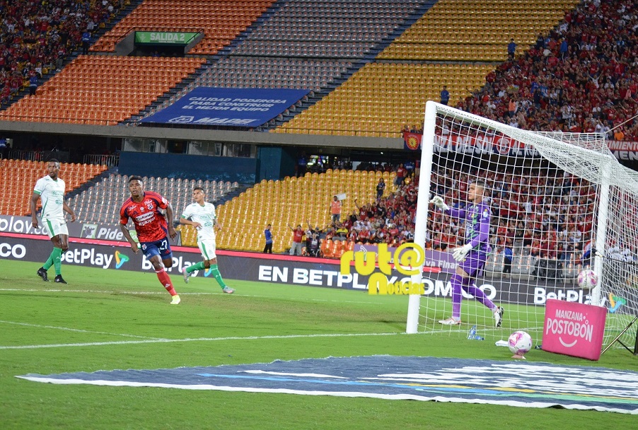 Por eso, apenas a los 4 minutos del primer tiempo se dio el primer gol, ante un Bucaramanga que venía como el club más sólido del Fútbol colombiano. Cobro de tiro libre que Brayan León envía al fondo de la red, para augurar que el partido iba a tener muchas emociones.