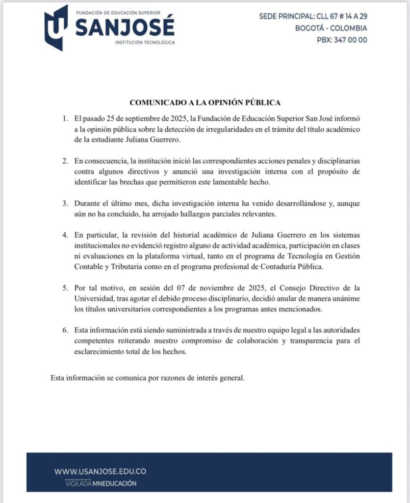 Según un comunicado de la Universidad de San José, publicado muy pocas horas antes de vencerse la orden judicial para que este centro educativo entregara la información total de Juliana Guerrero a la congresista Jennifer Pedraza, en la revisión “…del historial académico de Juliana Guerrero en los sistemas institucionales no evidenció registro alguno de actividad académica, participación en clase ni evaluación en la plataforma virtual, tanto en el programa de Tecnología en Gestión Contable y Tributaria, como en el Programa profesional de Contaduría pública…