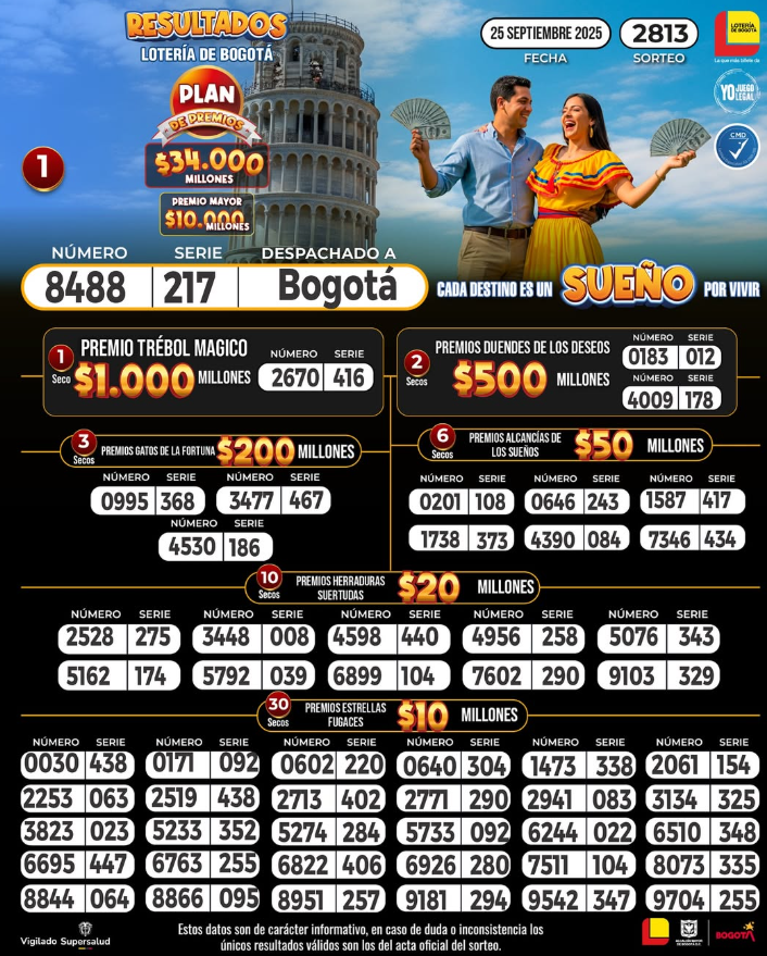 Pues el sorteo número 2813 en toda la historia de la Lotería de Bogotá dejó estos resultados, tanto en su premio mayor como sus 43 secos multimillonarios (que rifan desde 1.000 millones hasta 10 millones de pesos):