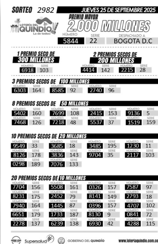 Y también sorteó la Lotería del Quindío, con un premio mayor de 2 mil millones de pesos ($ 2.000.000.000) y otros 44 premios secos, con estos resultados (para el sorteo número 2982):