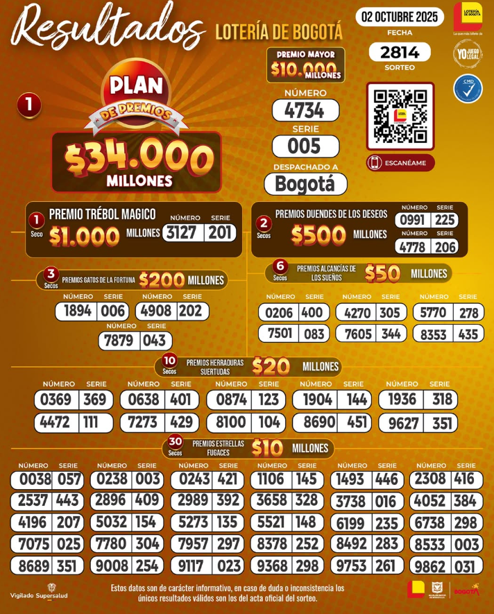Pues el sorteo número 2814 en toda la historia de la Lotería de Bogotá dejó estos resultados, tanto en su premio mayor como sus 43 secos multimillonarios (que rifan desde 1.000 millones hasta 10 millones de pesos):