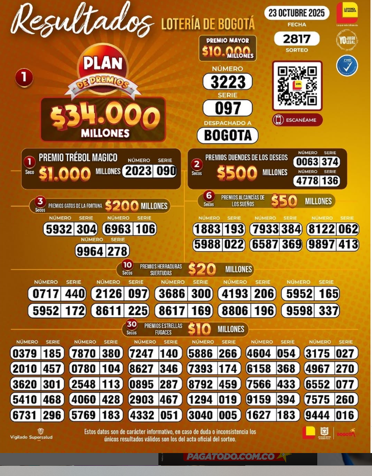 Pues el sorteo número 2817 en toda la historia de la Lotería de Bogotá dejó estos resultados, tanto en su premio mayor como sus 43 secos multimillonarios (que rifan desde 1.000 millones hasta 10 millones de pesos):