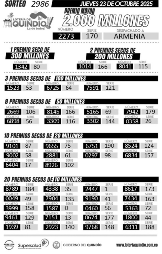 Y también sorteó la Lotería del Quindío, con un premio mayor de 2 mil millones de pesos ($ 2.000.000.000) y otros 44 premios secos, con estos resultados (para el sorteo número 2986):