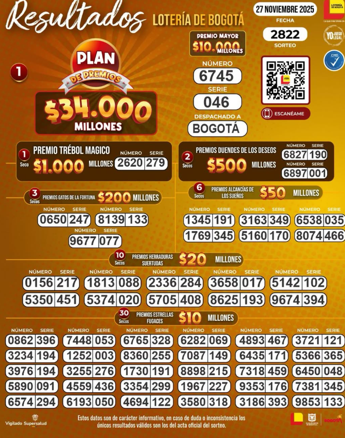 Pues el sorteo número 2822 en toda la historia de la Lotería de Bogotá dejó estos resultados, tanto en su premio mayor como sus 43 secos multimillonarios (que rifan desde 1.000 millones hasta 10 millones de pesos):