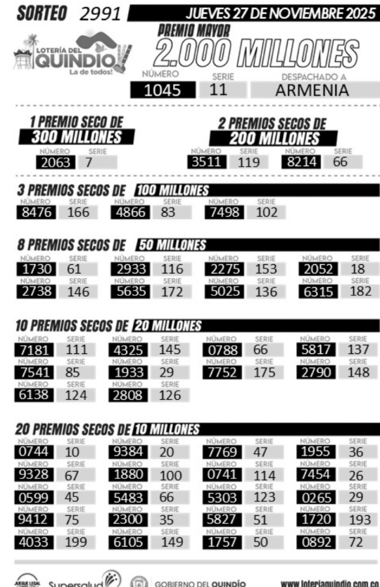 Y también sorteó la Lotería del Quindío, con un premio mayor de 2 mil millones de pesos ($ 2.000.000.000) y otros 44 premios secos, con estos resultados (para el sorteo número 2991):