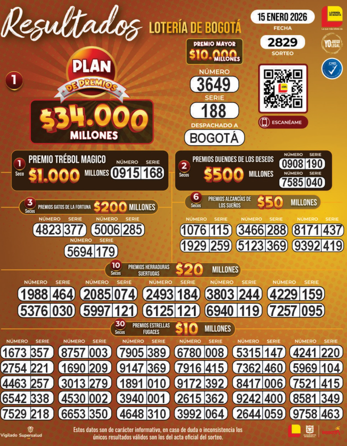 Pues el sorteo número 2829 en toda la historia de la Lotería de Bogotá dejó estos resultados, tanto en su premio mayor como sus 43 secos multimillonarios (que rifan desde 1.000 millones hasta 10 millones de pesos):