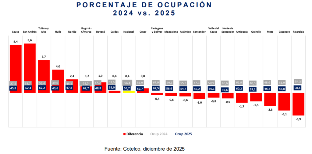 La Asociación Hotelera y Turística de Colombia (Cotelco) presentó el balance de la ocupación hotelera correspondiente a diciembre de 2025 y el acumulado del año, evidenciando un comportamiento estable del sector, con variaciones moderadas frente a años anteriores y contrastes regionales relevantes.