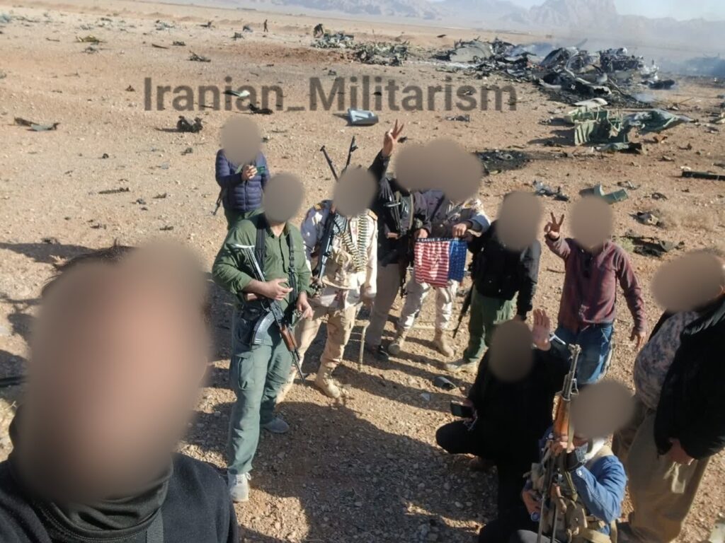 Muy curiosamente, los medios iraníes muestran a combatientes de la Guardia Iraní, de civil, exhibiendo los pantaloncillos de una recluta americano, con la bandera de Estados Unidos estampada en ellos, sin que se sepa qué pasó con su dueño y menos como alguien en medio de una batalla deja sus pantaloncillos cerca de los restos de un avión, de dos helicópteros e incluso de un Dron MQ – 9 ‘Reaper’, también derribado.
