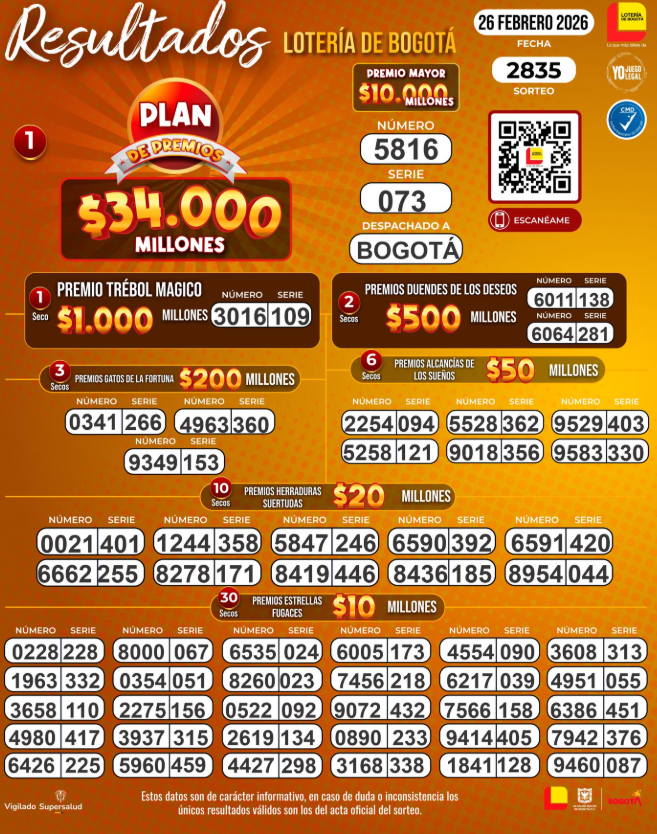 Pues el sorteo número 2834 en toda la historia de la Lotería de Bogotá dejó estos resultados, tanto en su premio mayor como sus 43 secos multimillonarios (que rifan desde 1.000 millones hasta 10 millones de pesos):