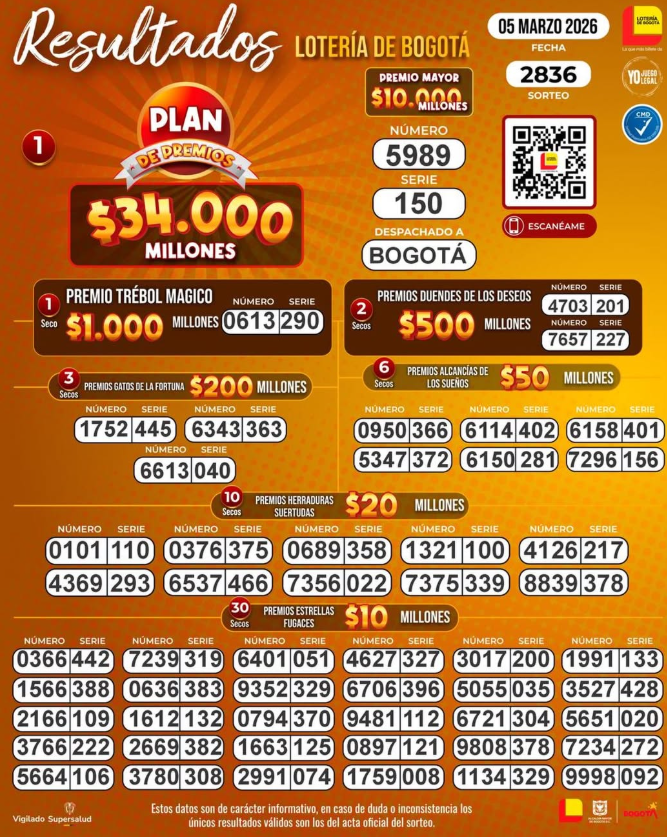 Pues el sorteo número 2836 en toda la historia de la Lotería de Bogotá dejó estos resultados, tanto en su premio mayor como sus 43 secos multimillonarios (que rifan desde 1.000 millones hasta 10 millones de pesos):