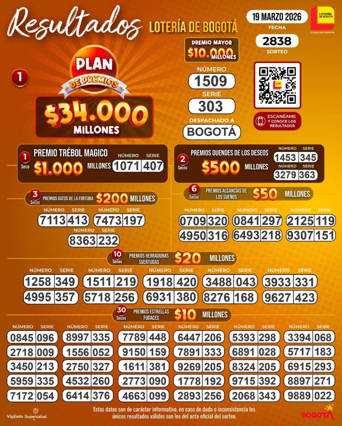 Pues el sorteo número 2838 en toda la historia de la Lotería de Bogotá dejó estos resultados, tanto en su premio mayor como sus 43 secos multimillonarios (que rifan desde 1.000 millones hasta 10 millones de pesos):