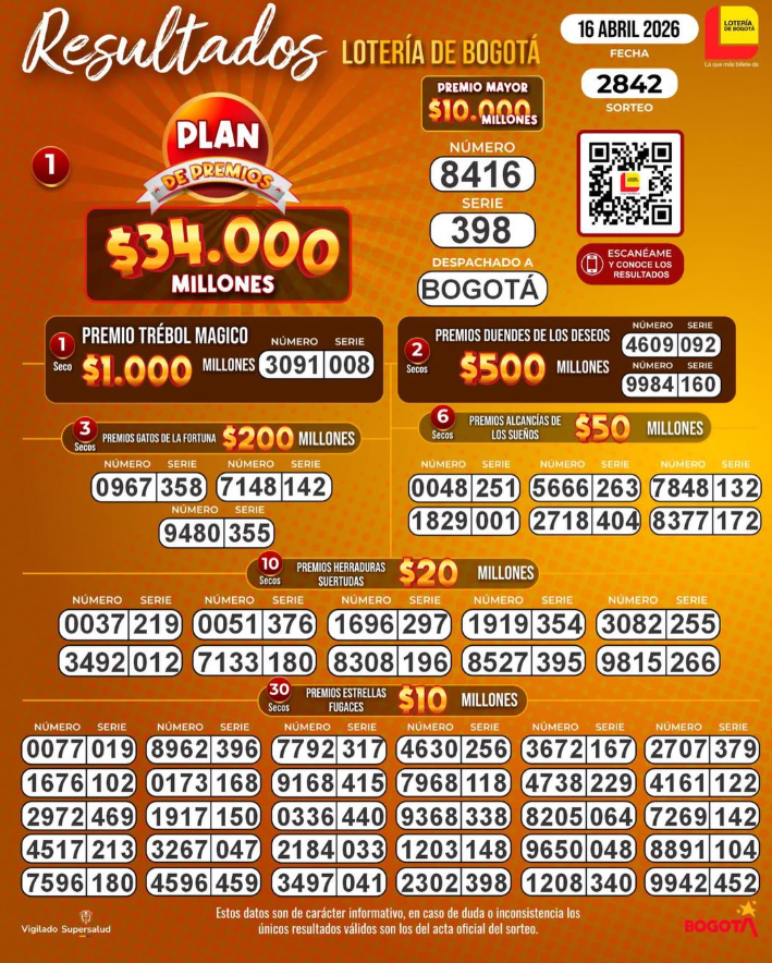 Pues el sorteo número 2841 en toda la historia de la Lotería de Bogotá dejó estos resultados, tanto en su premio mayor como sus 43 secos multimillonarios (que rifan desde 1.000 millones hasta 10 millones de pesos):
