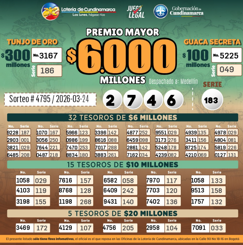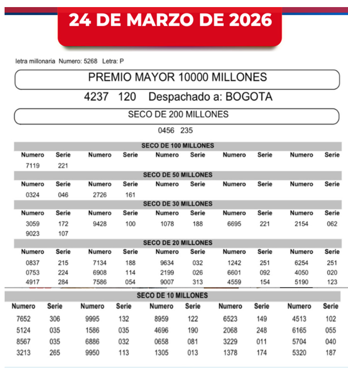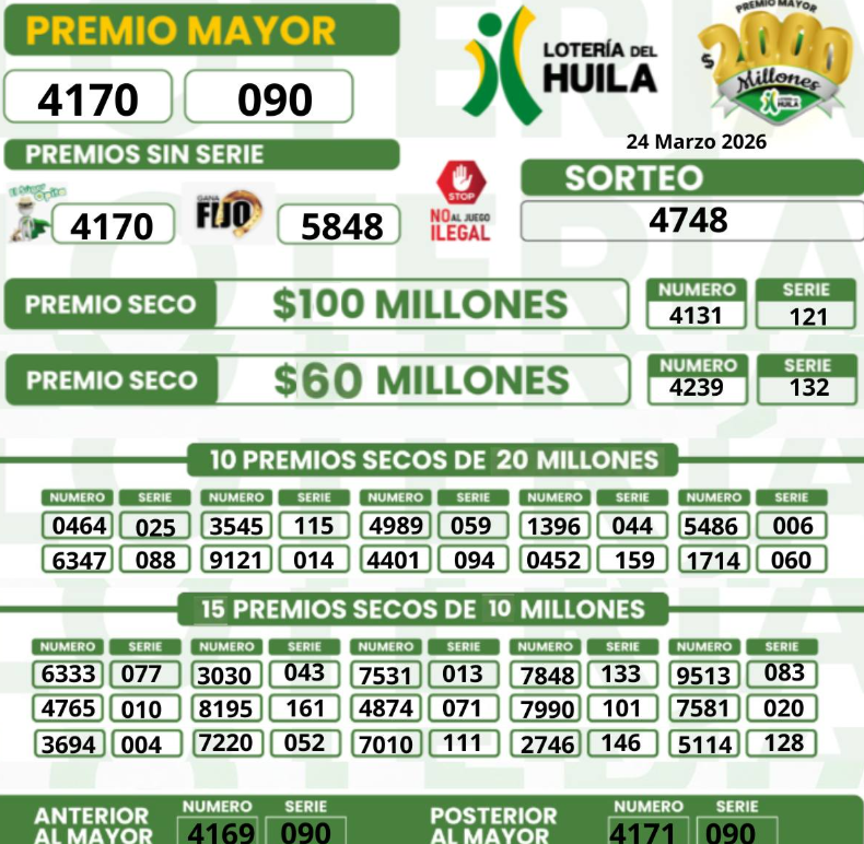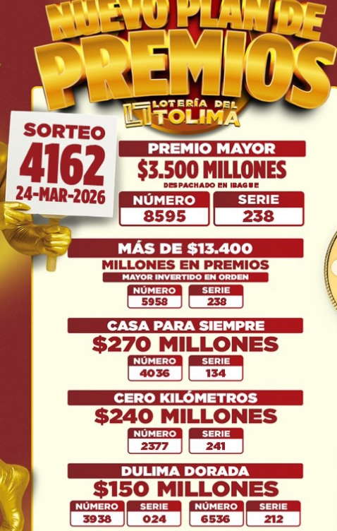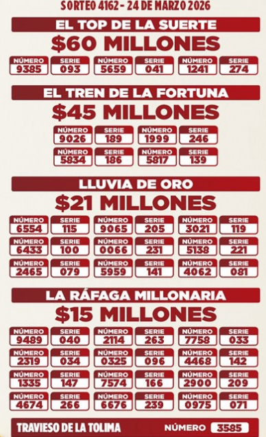 Como fue lunes festivo, se acumularon los sorteos para este martes, así que le traemos el resultado de la Lotería de La Cruz Roja y el resultado de la Lotería de Cundinamarca y también la del Tolima, porque si compró y jugó, ojalá se llene de buenas noticias…y hasta la Lotería del Huila, que también sorteó este 24 de MARZO de 2026.