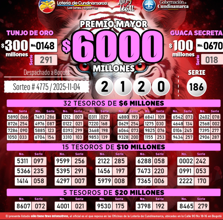 Como fue lunes festivo, se acumularon los sorteos para este martes, así que le traemos el resultado de la Lotería de La Cruz Roja y el resultado de la Lotería de Cundinamarca y también la del Tolima, porque si compró y jugó, ojalá le traigamos buenas noticias…y hasta la Lotería del Huila, que también sorteó este 4 de NOVIEMBRE de 2025.