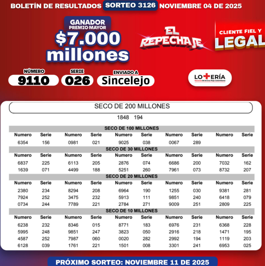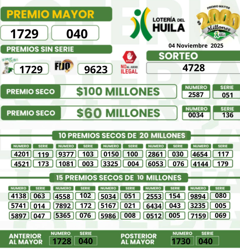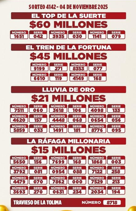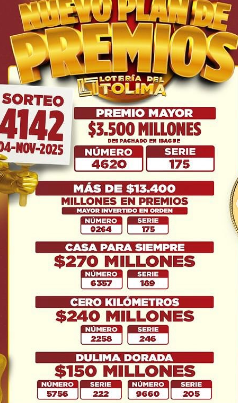 Además, otros 3 mil millones de pesos que sorteó la Lotería del Tolima. Más cerca de 100 premios secos rifados entre las tres loterías, todos sorteados este MARTES 4 de NOVIEMBRE del año 2025. Y 2.000 millones de pesos de la Lotería del Huila.