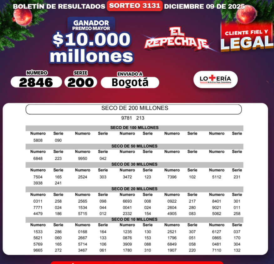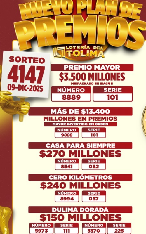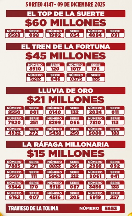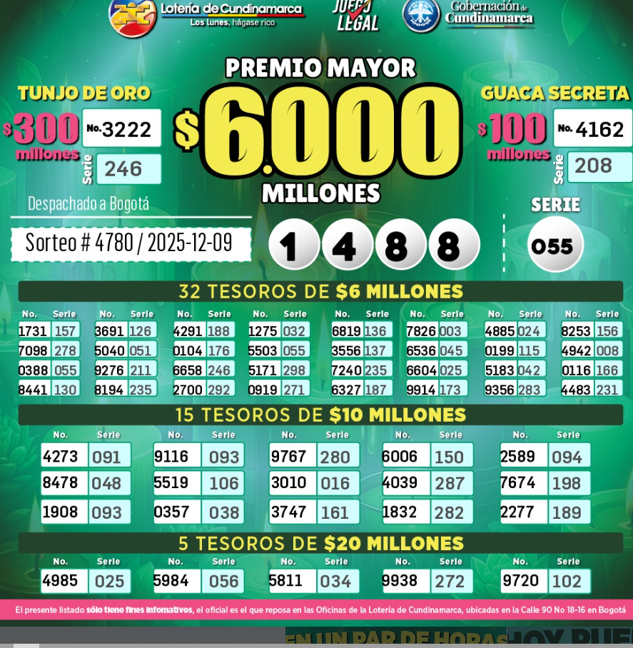Como fue lunes festivo, se acumularon los sorteos para este martes, así que le traemos el resultado de la Lotería de La Cruz Roja y el resultado de la Lotería de Cundinamarca y también la del Tolima, porque si compró y jugó, ojalá se llene de buenas noticias…y hasta la Lotería del Huila, que también sorteó este 9 de DICIEMBRE de 2025.