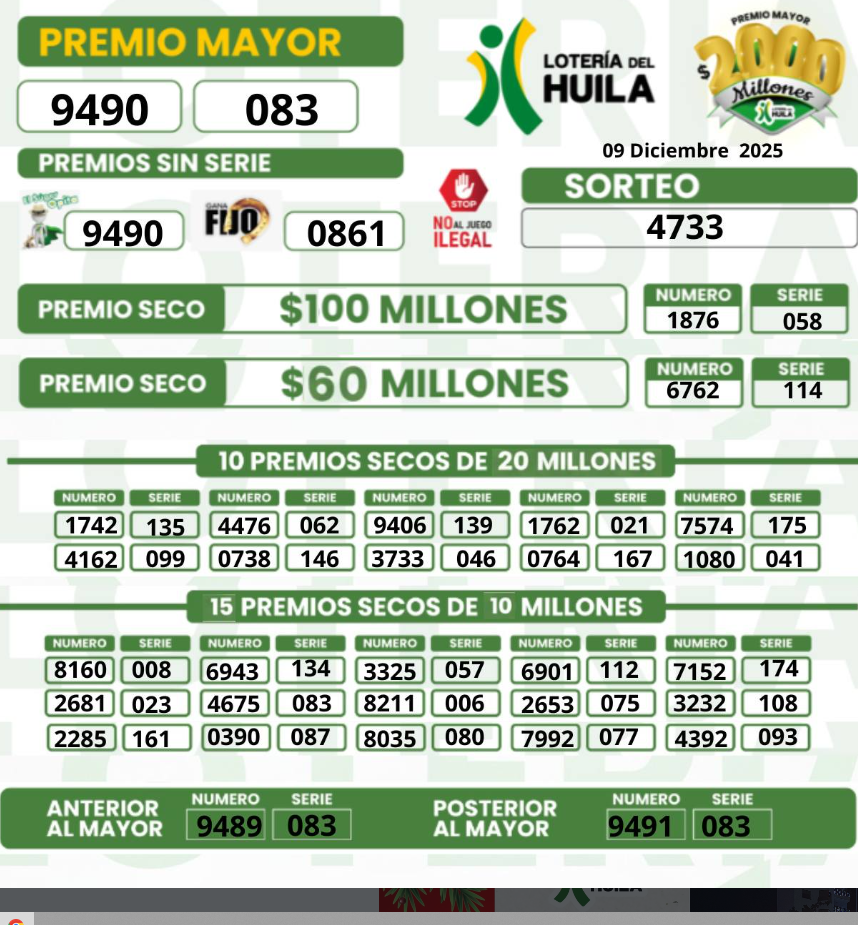 Y le traemos otro de los sorteos del martes 9 de DICIEMBRE con el resultado de la Lotería del Huila, que tiene un premio mayor de 2 mil millones de pesos: