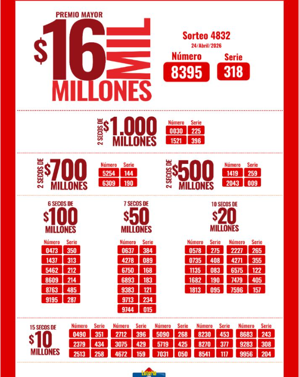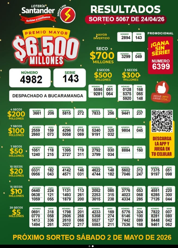 También está la Lotería de Santander, que sortea 6 mil 500 millones de pesos ($ 6.500.000.000) de premio mayor y todos estos premios secos: