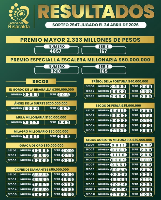 Este es el resultado de la Lotería de Medellín, la de Risaralda y la de Santander para el viernes 24 de ABRIL de 2026, con noticias millonarias para los jugadores.
