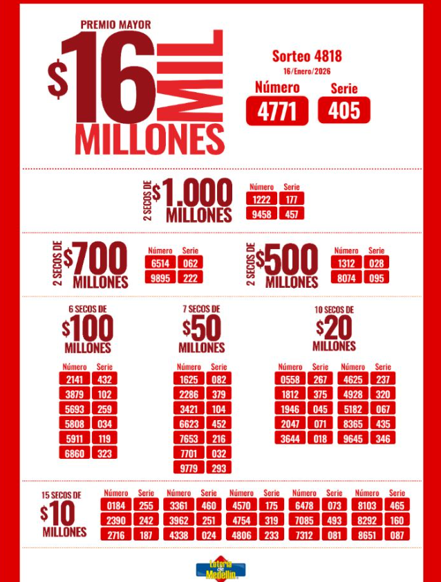 Este viernes “la de Medellín” sorteó un GRAN premio mayor de diez y seis mil millones de pesos ($ 16.000.000.000) y más de 30 premios secos: