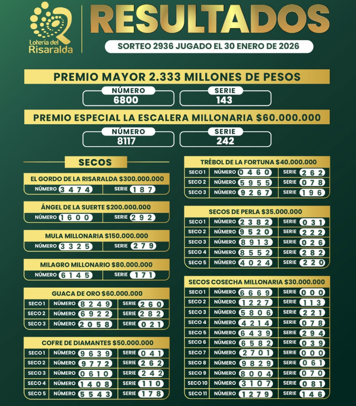 Este es el resultado de la Lotería de Medellín, la de Risaralda y la de Santander para el viernes 30 de ENERO de 2026, con noticias millonarias para los jugadores.