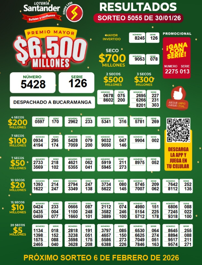 También está la Lotería de Santander, que sortea 6 mil 500 millones de pesos ($ 6.500.000.000) de premio mayor y todos estos premios secos: