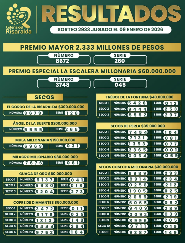 Este es el resultado de la Lotería de Medellín, la de Risaralda y la de Santander para el viernes 9 de ENERO de 2026, con noticias millonarias para los jugadores.