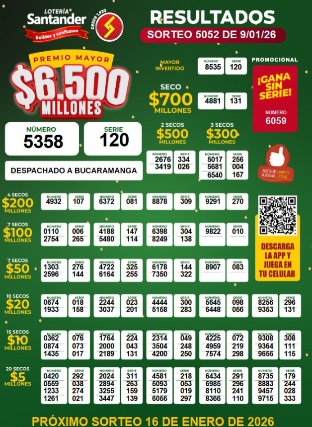 También está la Lotería de Santander, que sortea 6 mil 500 millones de pesos ($ 6.500.000.000) de premio mayor y todos estos premios secos: