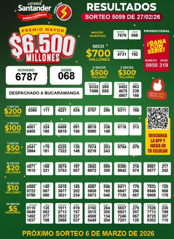 También está la Lotería de Santander, que sortea 6 mil 500 millones de pesos ($ 6.500.000.000) de premio mayor y todos estos premios secos: