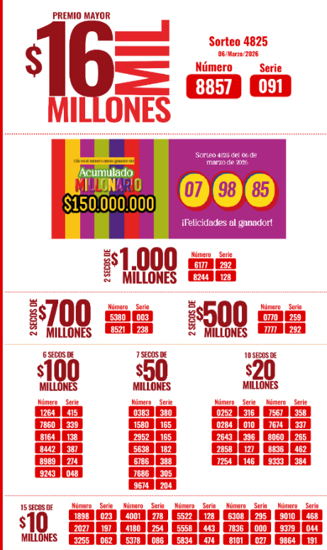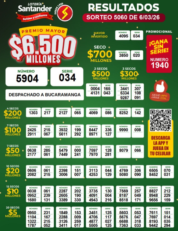 También está la Lotería de Santander, que sortea 6 mil 500 millones de pesos ($ 6.500.000.000) de premio mayor y todos estos premios secos:
