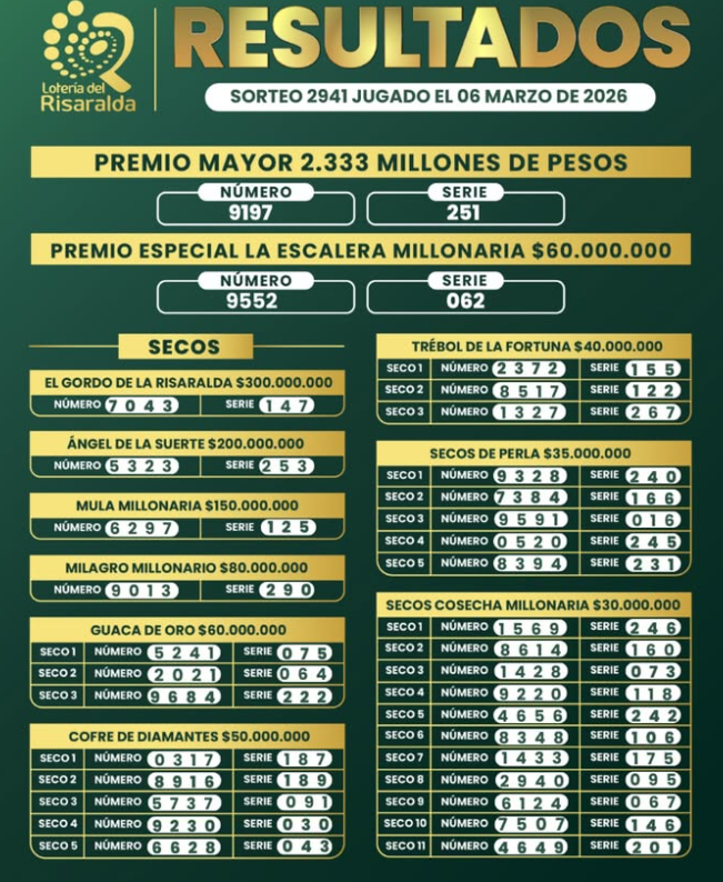 Este es el resultado de la Lotería de Medellín, la de Risaralda y la de Santander para el viernes 6 de MARZO de 2026, con noticias millonarias para los jugadores.