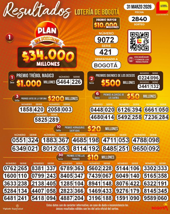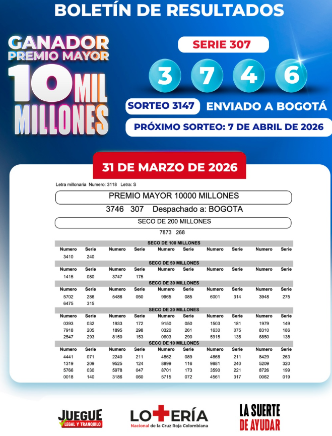 Como jueves y viernes son los festivos de Semana Santa, se cambiaron los días del sorteo y ahora tenemos para los apostadores los resultados de las Loterías de Bogotá, la Cruz Roja y la del Huila, que rifaron este martes 31 de marzo.