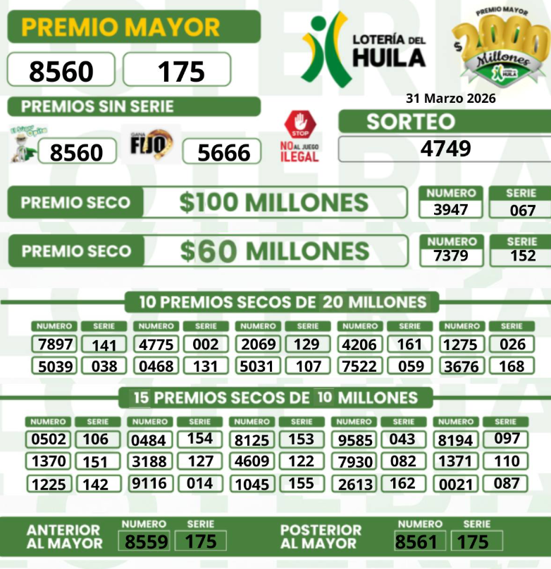 Recuerda que en www.rutanoticias.co siempre encuentras los resultados de las loterías del pasado martes y de cada sorteo en Colombia. ¡No te pierdas la oportunidad de revisar si eres uno de los afortunados ganadores! incluyendo la del Huila, con estos premios y resultados multimillonarios: