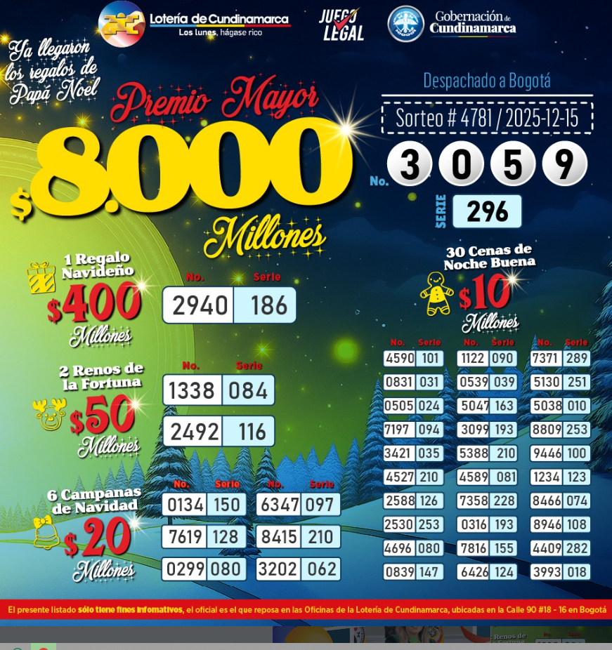Y muy juicioso ponga OJO al resultado de la Lotería de Cundinamarca, pero también revise los 54 premios secos millonarios que entrega este sorteo del lunes 15 de DICIEMBRE: