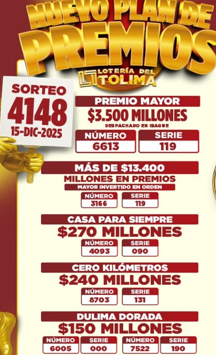 Y OJO…muy importante que revise bien la Lotería del Tolima, porque el premio mayor de 3 mil 500 millones de pesos fue vendido en Ibagué.