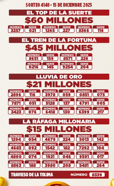 Y OJO al resultado de la Lotería de Cundinamarca y además la Lotería del Tolima, sorteadas en DICIEMBRE 15 de 2025, porque todos estos premios tienen retención en la fuente e impuesto de ganancias ocasionales que suman un total de TREINTA y SIETE por ciento (37%), así que revise, reste, descuente y fíjese cuánto le queda del premio ganado.