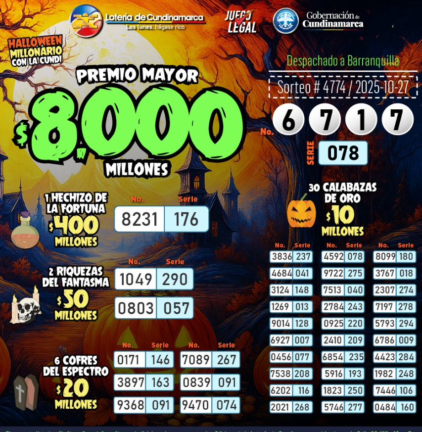 Y muy juicioso ponga OJO al resultado de la Lotería de Cundinamarca, pero también revise los 54 premios secos millonarios que entrega este sorteo del lunes 27 de OCTUBRE: