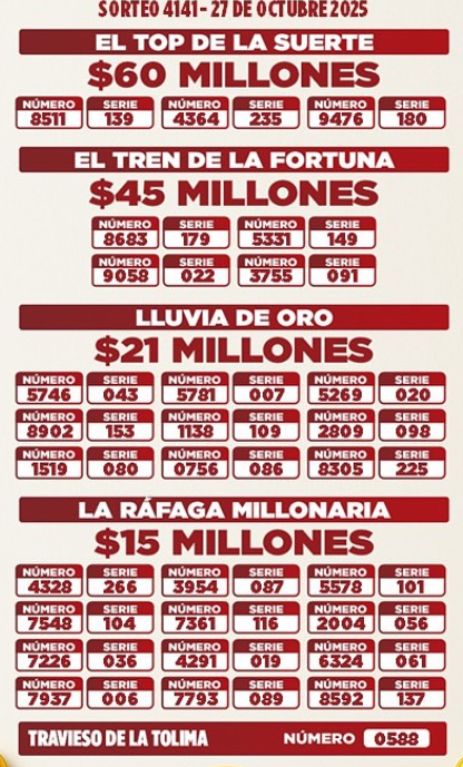 También sorteó la Lotería del Tolima y estos son los resultados de su premio mayor y sus premios secos multimillonarios. El Premio mayor correspondió al número 4820 de la serie 123. Y estos son todos sus premios: