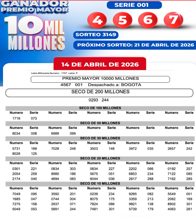 Este martes la Lotería de la Cruz Roja sorteó un premio mayor de 10.000 millones de pesos ( $ 10.000.000.000), una cifra realmente atractiva. Además, puedes consultar todos los premios secos de la Lotería de la Cruz Roja, que van desde los 300 millones hasta los 10 millones de pesos: