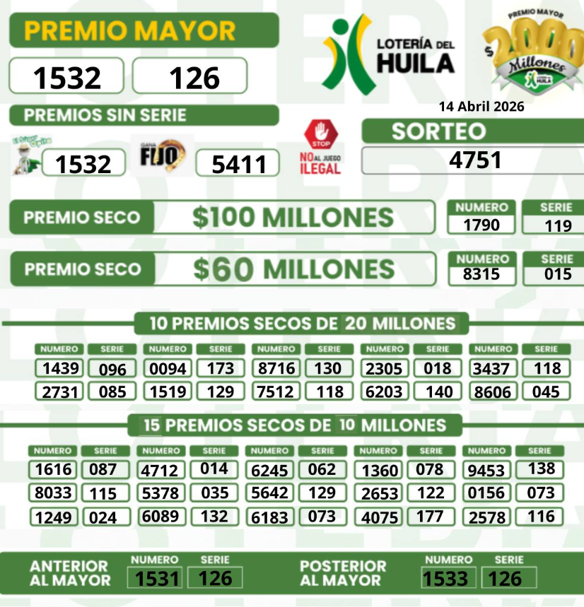 ¿Quieres saber cuál es el resultado de las Loterías de la Cruz Roja y la del Huila del martes 14 de ABRIL de 2026? La respuesta la encuentras en www.rutanoticias.co , porque queremos que seas feliz.