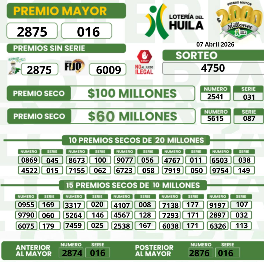 Recuerda que en www.rutanoticias.co siempre encuentras los resultados actualizados de las loterías del pasado martes y de cada sorteo en Colombia. ¡No te pierdas la oportunidad de revisar si eres uno de los afortunados ganadores! incluyendo la del Huila, con estos premios y resultados multimillonarios: