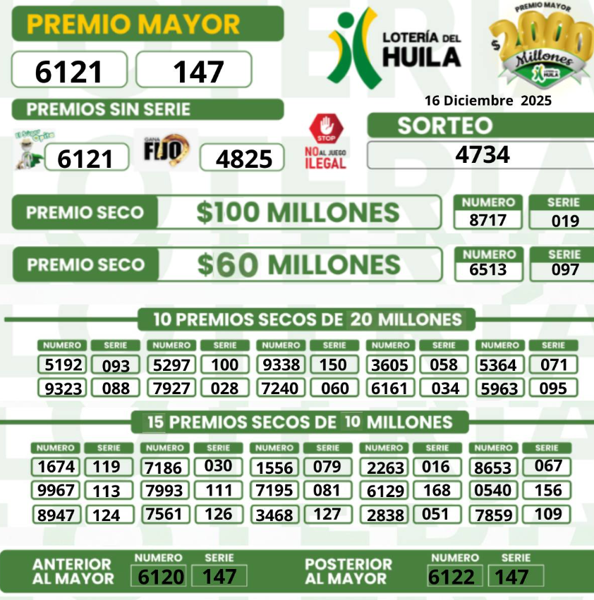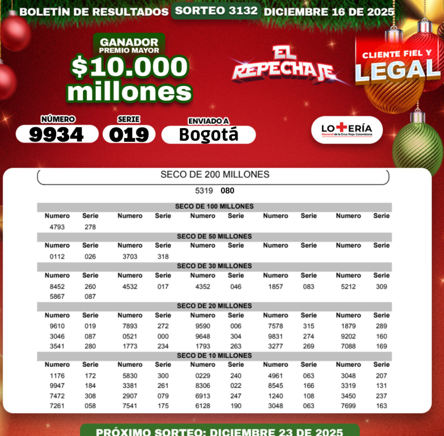 Este martes 16 de DICIEMBRE del año 2025 jugaron las Loterías de la Cruz Roja y la del Huila, para un total de 13.800 millones de pesos, solo sumando sus dos premios mayores.