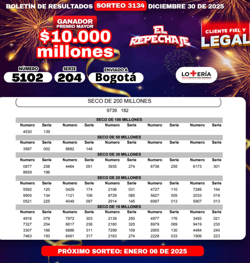 Su premio mayor, en preámbulo del año nuevo, es de 10.000 millones de pesos ($ 10.000.000.000) y es muy atractivo, además, revise todos los premios secos de la Lotería de La Cruz Roja, que van desde los 200 millones hasta los diez millones de pesos: