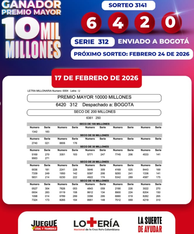 El premio mayor ahora es de 10.000 millones de pesos ($10.000.000.000), una cifra realmente atractiva. Además, puedes consultar todos los premios secos de la Lotería de la Cruz Roja, que van desde los 300 millones hasta los 10 millones de pesos: