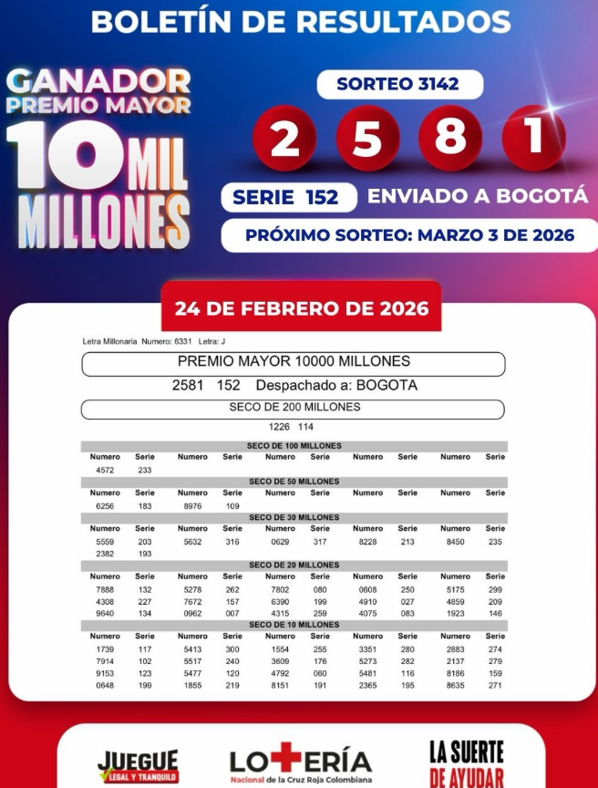 El premio mayor ahora es de 10.000 millones de pesos ($10.000.000.000), una cifra realmente atractiva. Además, puedes consultar todos los premios secos de la Lotería de la Cruz Roja, que van desde los 300 millones hasta los 10 millones de pesos: