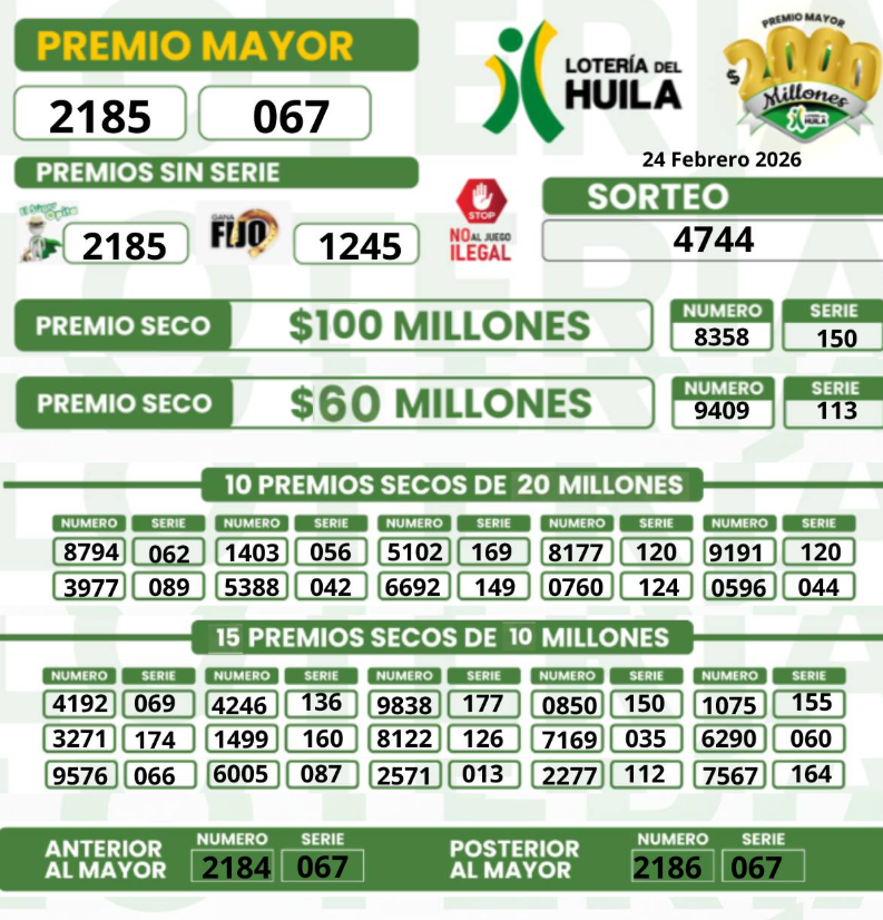 Recuerda que en www.rutanoticias.co siempre encuentras los resultados actualizados de las loterías del pasado martes y de cada sorteo en Colombia. ¡No te pierdas la oportunidad de revisar si eres uno de los afortunados ganadores! incluyendo la del Huila, con estos premios y resultados multimillonarios: