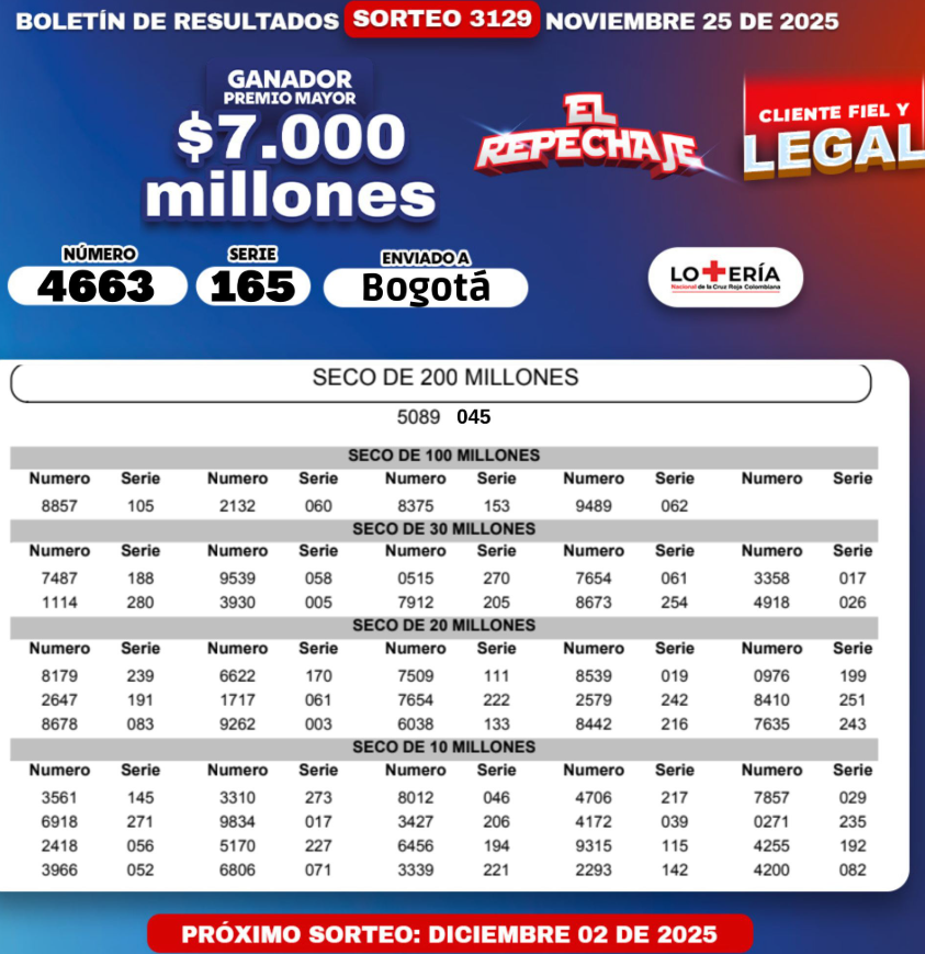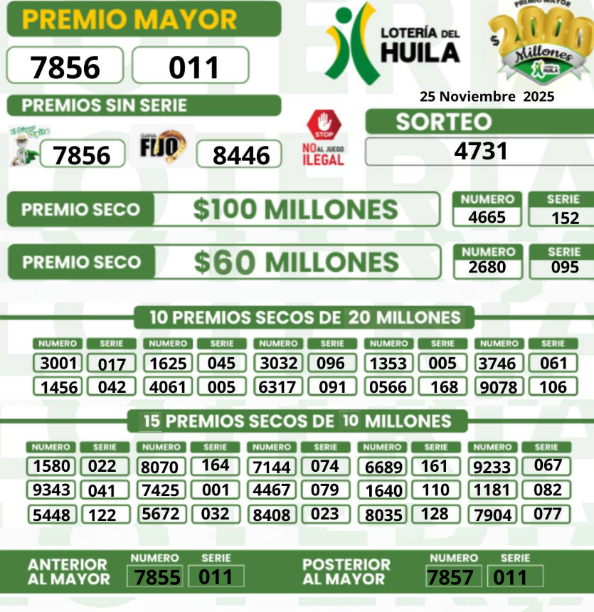 Este martes 25 de NOVIEMBRE del año 2025 jugaron las Loterías de la Cruz Roja y la del Huila, para un total de 9.000 millones de pesos, solo sumando sus dos premios mayores.